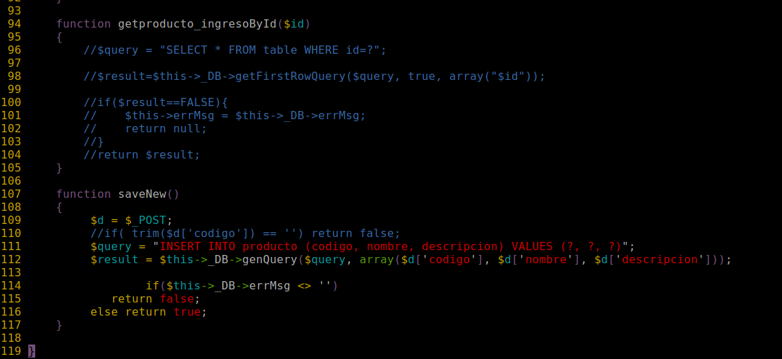 5.- Modificar el archivo «paloSantoproducto_ingreso.class.php» ubicado en /var/www/html/modules/producto_ingreso/libs/ el cual que corresponde a la clase del módulo