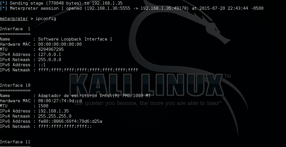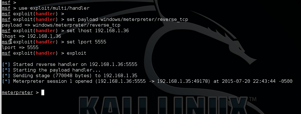 set LHOST : 192.168.1.36 ( IP de Kali Linux)