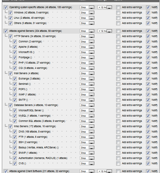 Podemos verificar las firmas, políticas por cada firma, log, duración de drop en caso se haya producción un ataque y también un extra warning.