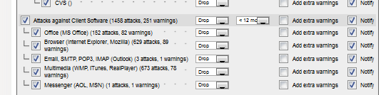 Como podemos verificar la cantidad de firmas relacionadas por ejemplo a ataques web es ínfima, así que el nombre de «UTM» una vez mas queda de lado cuando se trata de seguridad, sin embargo posee una gran variedad de protección a nivel de client (buffer overflow, malware etc)