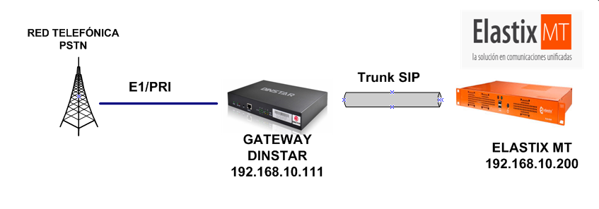 En este caso vamos a tener ElastixMT troncalizado via SIP con un Gateway de la marca Dinstar que a su vez está configurado para conversar con un E1 PRI de algún proveedor.