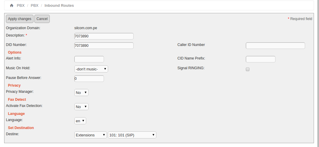 Vamos a PBX / PBX / Inbound Routes y creamos la ruta de la siguiente forma :