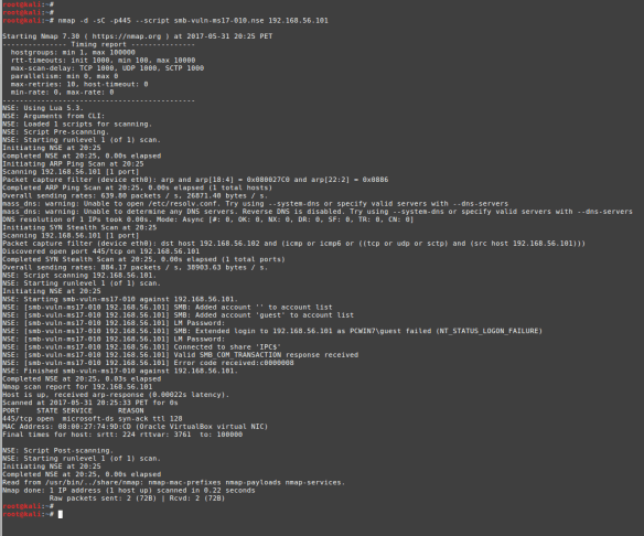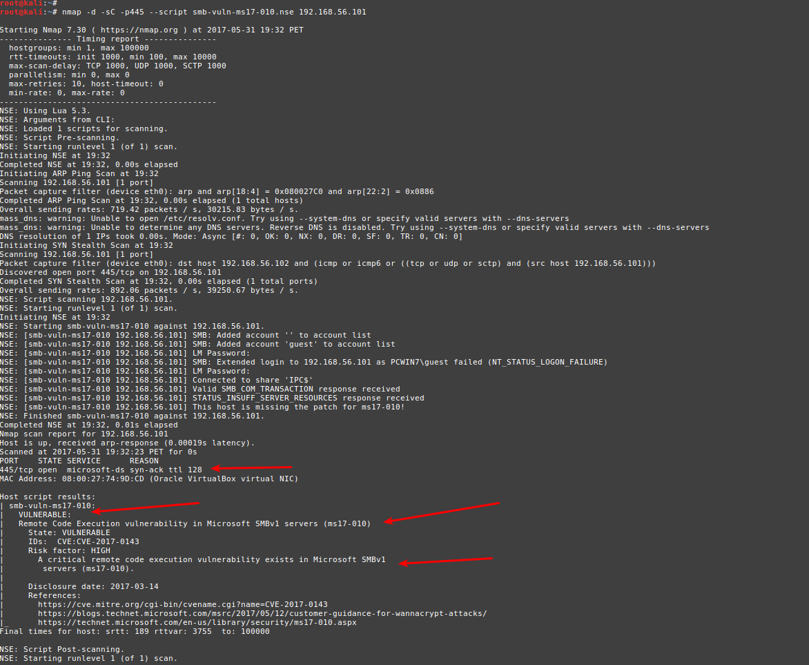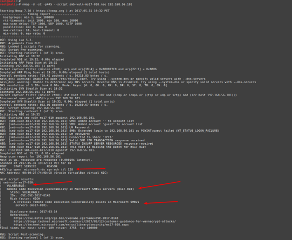 nmap -d -sC -p445 –script smb-vuln-ms17-010.nse 192.168.56.101