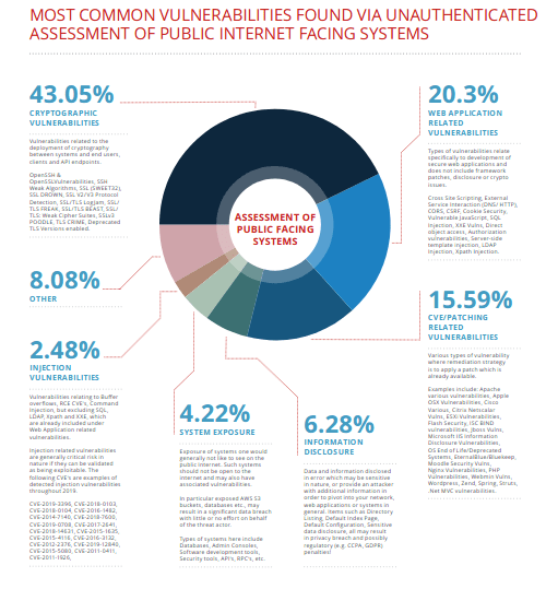 43% en vulnerabilidades en criptografia, implementaciones de servidor, clientes y APIs/Endpoints en el uso de algoritmos debiles.